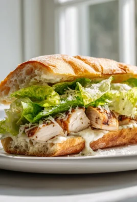 This Crispy Chicken Caesar Sandwich is incredibly versatile, too. Feel free to experiment with different types of cheese. A sharp cheddar or even a creamy pepper jack would add a delightful twist. If you’re a bacon lover, adding a few crispy strips would elevate the sandwich to another level. For a vegetarian option, swap the chicken for grilled halloumi cheese or crispy fried tofu – the Caesar dressing will still be the star! You can also adjust the amount of dressing to your liking; some prefer a more generous drizzle, while others prefer a lighter touch. And don’t be afraid to get creative with your toppings! A sprinkle of Parmesan cheese, a few croutons, or even some sun-dried tomatoes can add extra layers of flavor and texture.